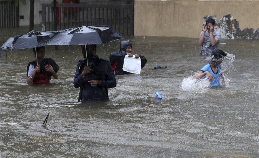 La gente se abre camino a través de una calle inundada en Mumbai, India, septiembre del 2019. [Foto: Agencias]