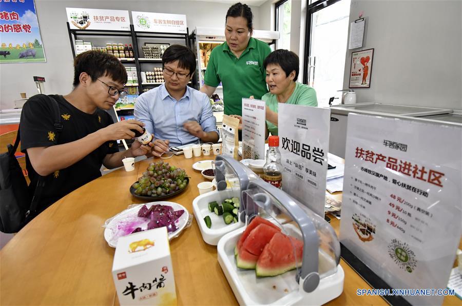 Residentes prueban los productos agrícolas en una tienda de conveniencia, en Beijing, capital de China, el 26 de julio de 2018. Los distritos de Haidian, Xicheng y Chaoyang han introducido un nuevo tipo de tiendas de conveniencia que permita a los consumidores comprar en línea y recibir los productos que compran en tiendas. Los residentes pueden comprar productos agrícolas de Mongolia Interior como una forma de alivio de la pobreza. (Xinhua/Li Xin)