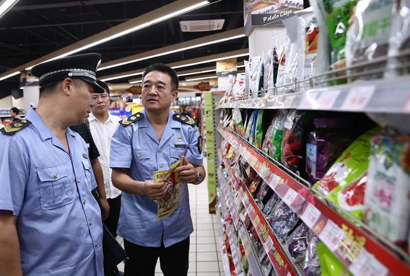 Los inspectores de la policía verifican la calidad de los alimentos en un supermercado en el distrito Xicheng de Beijing, el 26 de junio de 2019. [Foto de Zou Hong / China Daily]