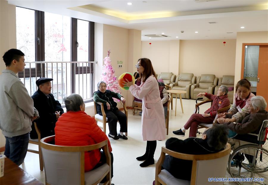 Trabajadoras interactúan con personas mayores en un establecimiento de servicio guardería basado en la comunidad para personas de la tercera edad en Shanghai, en el este de China, el 2 de enero de 2020. Shanghai ha intensificado los esfuerzos para avanzar en los servicios diversificados de atención a personas mayores radicadas en comunidades y familias, que brindan enfermería durante largos períodos, atención de día y vida asistida a personas mayores en las cercanías. (Xinhua/Liu Ying)