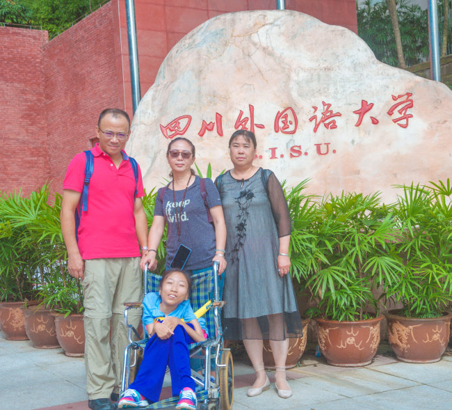 Xu Ruiyang y su familia se hacen una foto en grupo frente a la puerta de la escuela en la Universidad de Estudios Internacionales de Sichuan en Chongqing. [Foto / Universidad de Estudios Internacionales de Sichuan]