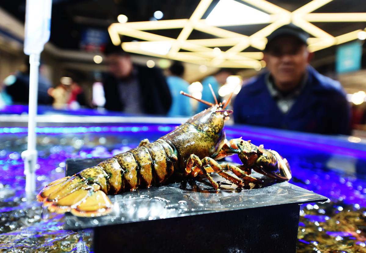 Un cliente revisa las langostas de Boston en un centro comercial en Hangzhou, capital de la provincia de Zhejiang. [Foto: Long Wei/China Daily]