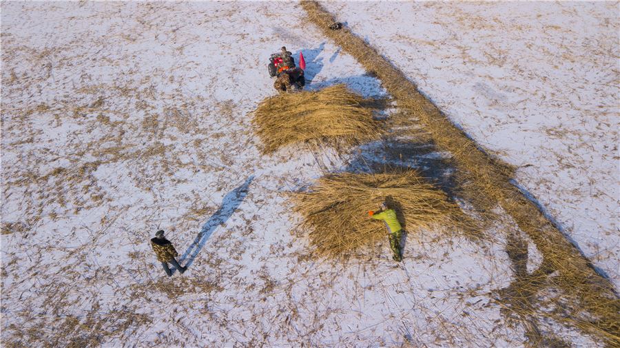 Los lugare?os cosechan ca?as en el Lago de Arena, un humedal bordeado por el desierto en la región autónoma Hui de Ningxia, en el noroeste de China. [Fotografía proporcionada a chinadaily.com.cn]
