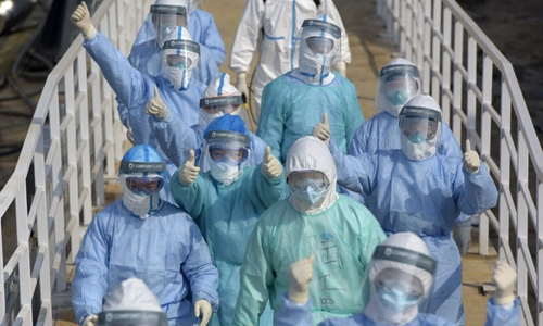 Los trabajadores médicos posan para una foto en el Hospital Huoshenshan (Monta?a del Dios del Fuego) en Wuhan, provincia de Hubei, en el centro de China, el 4 de febrero de 2020. (Foto de Fan Xianhai / Xinhua)