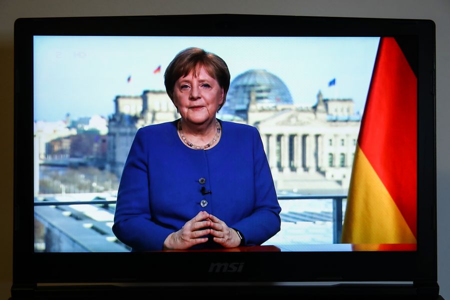 Imagen del 18 de marzo de 2020 de la canciller alemana Angela Merkel hablando durante un discurso televisado sobre el COVID-19, en Berlín, capital de Alemania. (Xinhua/Shan Yuqi)