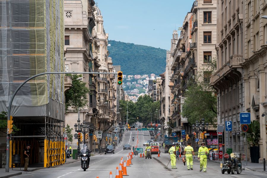 Imagen del 19 de mayo de 2020 de operadores modificando la circulación de vehículos para ampliar las aceras y garantizar el distanciamiento social de los peatones, en Barcelona, Espa?a. (Xinhua/Ayuntamiento de Barcelona)