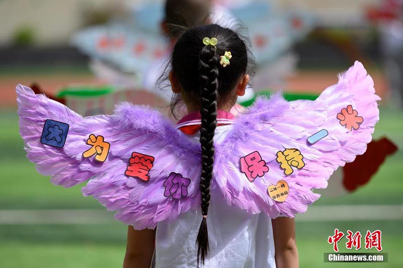 El 2 de junio, los estudiantes de los grados inferiores de la Escuela Primaria de Idiomas Extranjeros del Distrito Xinghualing en Taiyuan, Shanxi, volvieron a las aulas con unas "alas" que decían "Porque te amo, mantén un metro de distancia" para mantener una distancia segura en el centro. Por Wei Liang, Chinanews.com.