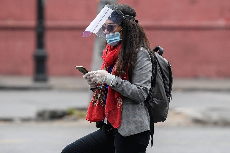 Una mujer porta una mascarilla y careta mientras observa su teléfono móvil en Santiago, capital de Chile, el 2 de junio de 2020. (Xinhua/Jorge Villegas)