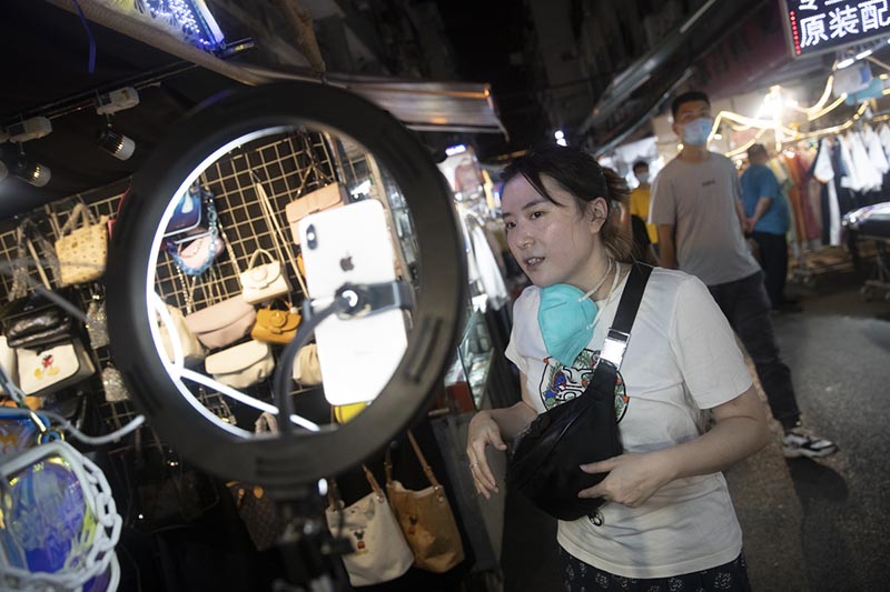 Una vendedora promociona sus productos a través de la transmisión en vivo en un mercado nocturno en la calle Baocheng en Wuhan, provincia de Hubei, centro de China, el 3 de junio de 2020. [Foto de Ke Hao / For chinadaily.com.cn]