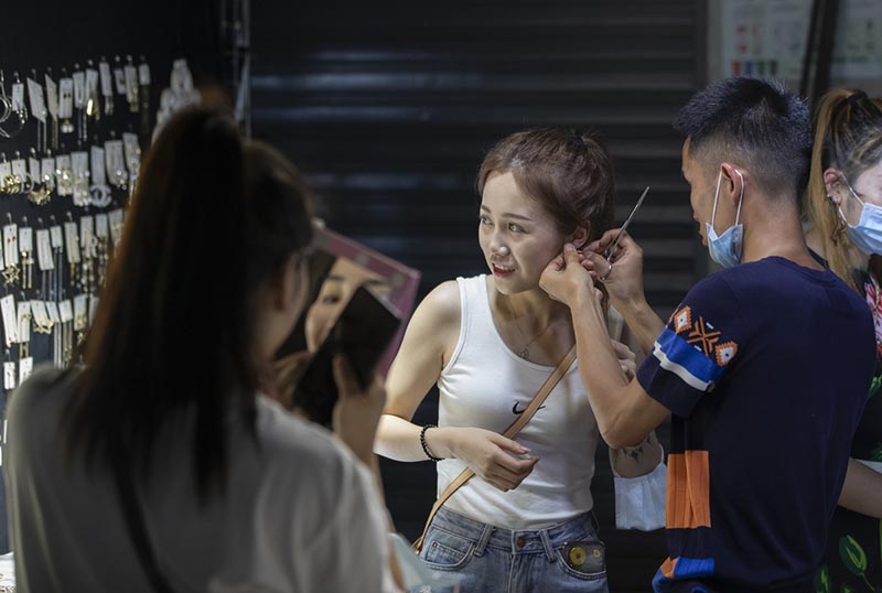 Una cliente se prueba un par de pendientes en un mercado nocturno en la calle Baocheng en Wuhan, provincia de Hubei, centro de China, el 3 de junio de 2020. [Foto de Ke Hao / For chinadaily.com.cn]