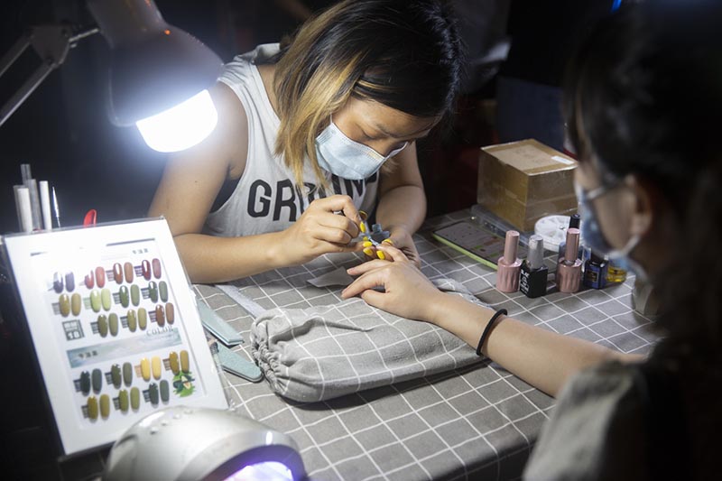 Una manicurista pinta u?as para una cliente en un mercado nocturno en la calle Baocheng en Wuhan, provincia de Hubei, centro de China, el 3 de junio de 2020. [Foto de Ke Hao / For chinadaily.com.cn]