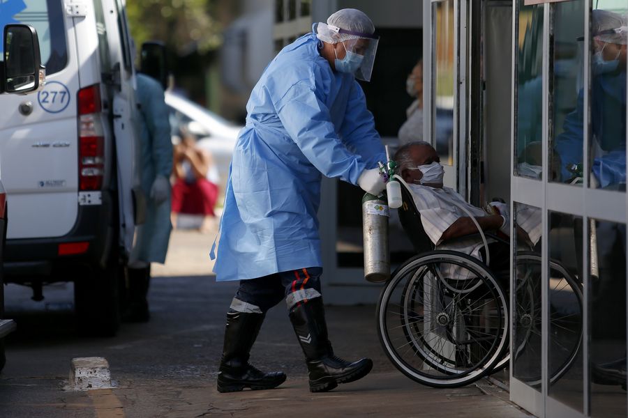 Un trabajador de la salud porta una mascarilla y careta mientras traslada a un paciente presuntamente diagnosticado con la enfermedad causada por el nuevo coronavirus (COVID-19) al Hospital Regional da Asa Norte, en Brasilia, Brasil, el 4 de junio de 2020. (Xinhua/Lucio Tavora)