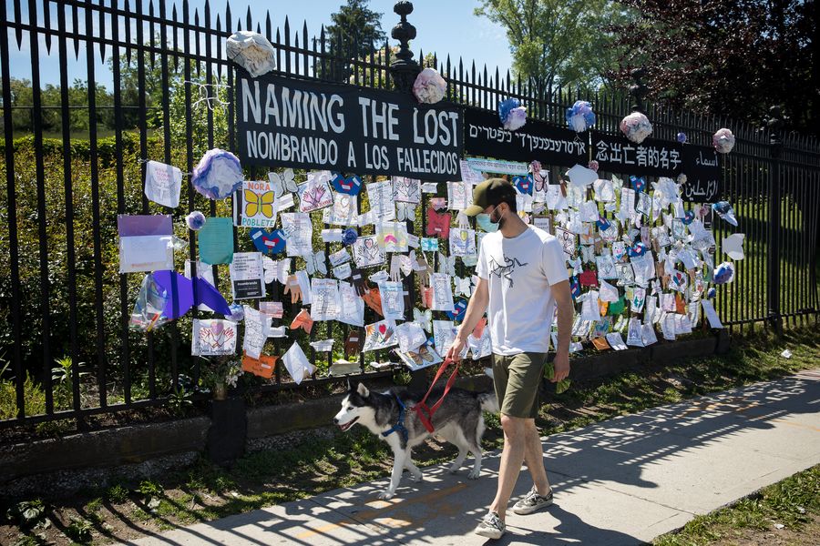 Un hombre porta una mascarilla mientras camina junto a un memorial para víctimas de COVID-19 frente al cementerio de Green-Wood, en el barrio de Brooklyn en Nueva York, Estados Unidos, el 27 de mayo de 2020. (Xinhua/Michael Nagle)