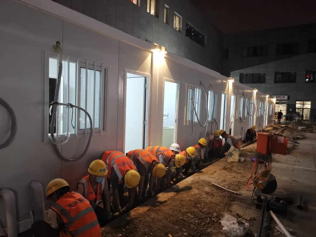 El 18 de junio, comenzaron los trabajos para desmantelar la zona verde, desinstalar las farolas, nivelar el suelo, instalar un sistema eléctrico, excavar las fosas para las tuberías de drenaje y suministro de agua, y construir los cimientos del centro provisional. A las 23:00 del día 19, siete camiones de transporte con la pancarta “Material antiepidémico del Hospital de la Universidad Médica Unión de Beijing” llegaron al hospital desde Langfang, donde se produjo dicho material, que llegaron al día siguiente. Los trabajadores completaron la instalación del centro provisional, las tuberías de agua, la electricidad, el sistema de ventilación, la línea telefónica y otros procesos esa misma noche. El 21 de junio, el proyecto de construcción del centro provisional para la realización de pruebas de ácido nucleico entró en la etapa final. Las se?ales de emergencia, las líneas de distancia de seguridad en el área de espera, la depuración del sistema, la limpieza y las pruebas de proceso se completaron de manera ordenada.