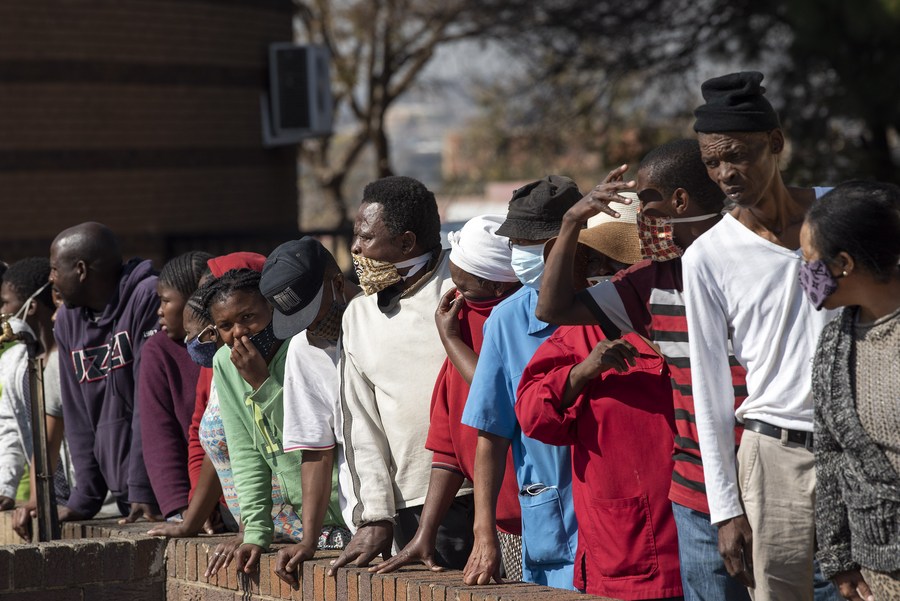 Ciudadanos hacen fila para obtener alimentos y suministros provistos por grupos de caridad en Soweto, al suroeste de Johannesburgo, Sudáfrica, el 5 de junio de 2020. (Xinhua/Chen Cheng)