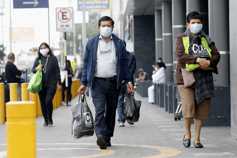 Personas portan mascarillas mientras caminan afuera de un centro comercial durante la cuarentena impuesta para prevenir la enfermedad causada por al nuevo coronavirus (COVID-19), en Lima, Perú, el 23 de junio de 2020. (Xinhua/Mariana Bazo)