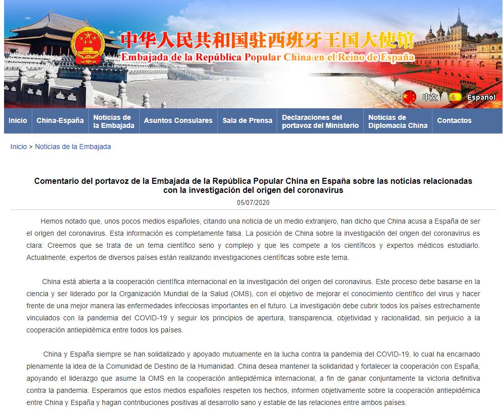 El portavoz de la embajada destacó que “unos pocos medios espa?oles, citando una noticia de un medio extranjero, han expresado que China acusa a Espa?a de ser el origen del coronavirus”.