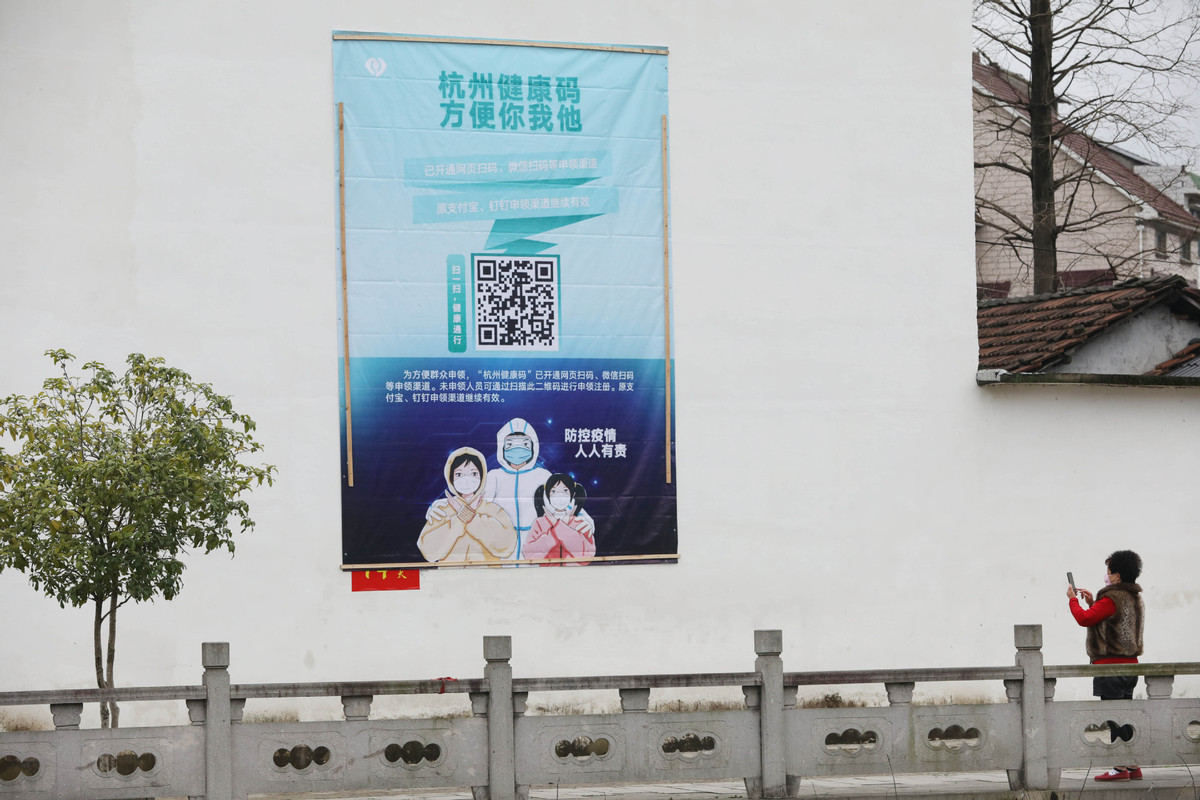 Una residente escanea el código QR en un póster para registrar su código de salud personal en Hangzhou, provincia de Zhejiang, este de China, el 15 de febrero de 2020. [Foto / Xinhua]