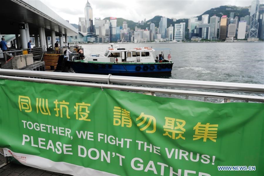 La foto del 20 de julio de 2020 muestra una pancarta con lemas sobre la lucha contra el COVID-19 en Tsim Sha Tsui, Hong Kong, sur de China.