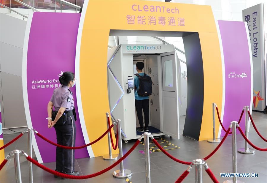 Foto del 1 de agosto de 2020 muestra una instalación de desinfección en la Exposición AsiaWorld en Hong Kong, sur de China.