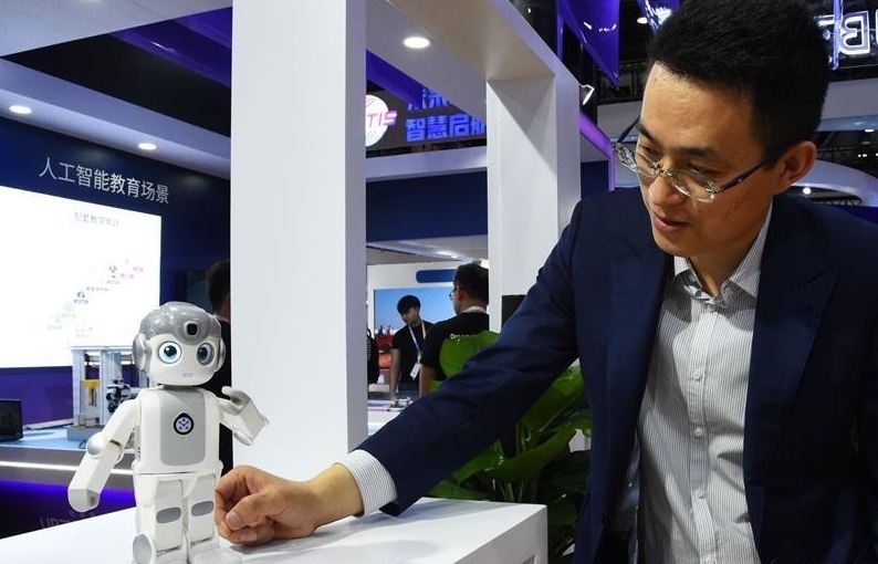 Un visitante interactúa con un robot inteligente portátil durante la Feria Internacional de Comercio de Servicios de China 2019, celebrada en Beijing. 28 de mayo del 2019. (Foto: Xinhua)