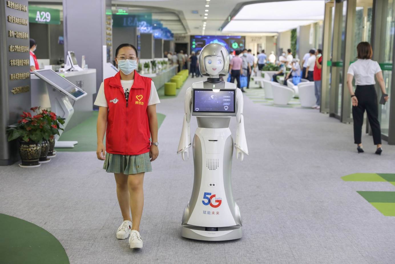 El 14 de agosto, en el Centro de Servicios Públicos y Gobernanza Social de Liuheng, en la ciudad de Zhoushan, el robot inteligente 5G "Xiao Liu" llevó a cabo un servicio relacionado con el gobierno. Este "nuevo empleado" realiza funciones de conversación, respuestas personalizadas, guía por voz, posicionamiento preciso y respuestas a asuntos gubernamentales. Por Chen Yongjian / Pueblo en Línea