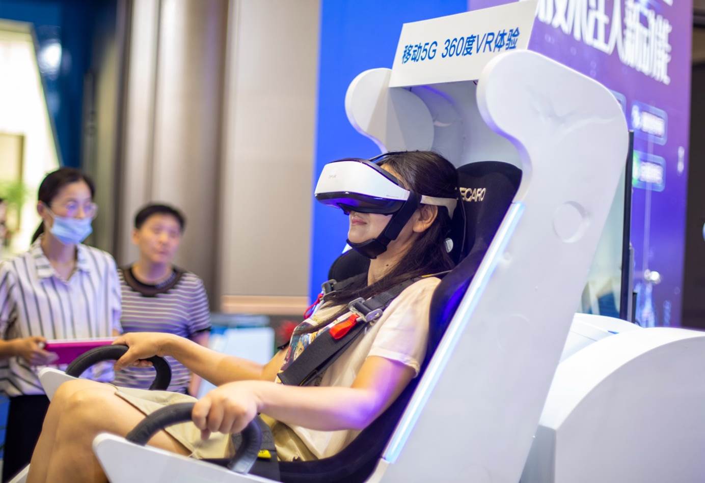 El 31 de julio, en una exposición sobre aplicaciones de nuevas infraestructuras en la ciudad de Nantong, provincia de Jiangsu, los visitantes probaron la tecnología de realidad virtual de 360 grados. Por Zhai Huiyong / Pueblo en Línea