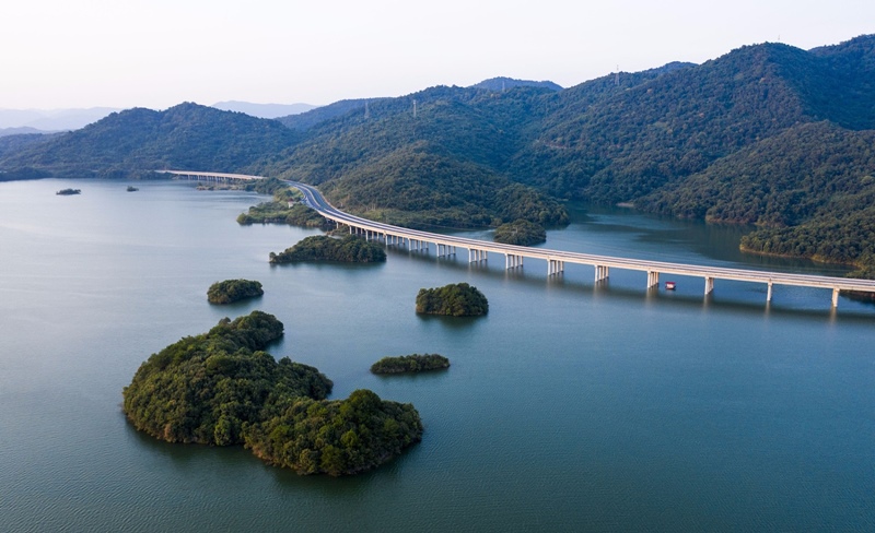 Vista aérea de la autopista que cruza el lago Xihai, en la monta?a Lushan, Jiujiang, provincia de Jiangxi, 7 de septiembre del 2020.