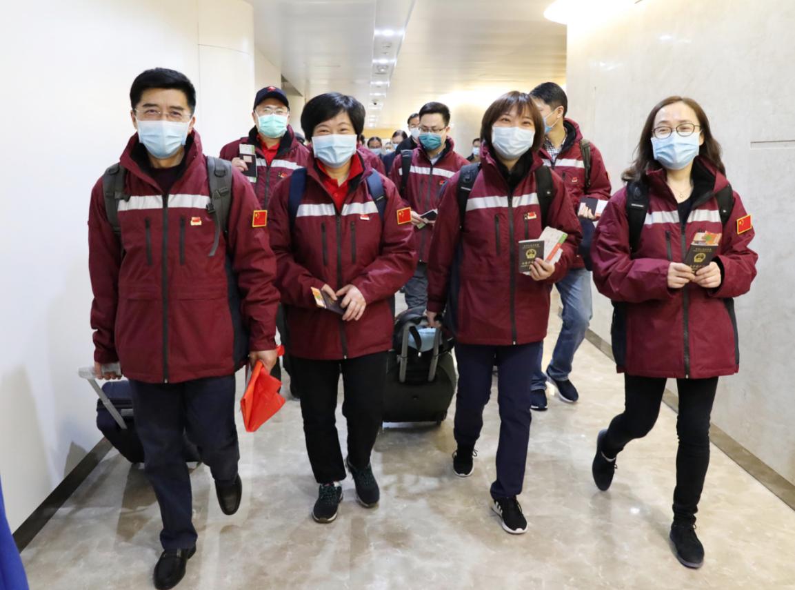 Un equipo médico compuesto por ocho expertos de primera línea de la provincia de Jiangsu llegan a Caracas, capital de Venezuela, para ayudar a los lugare?os a combatir la pandemia, 30 de marzo del 2020. [Foto: Huang Lei/ Chinadaily]