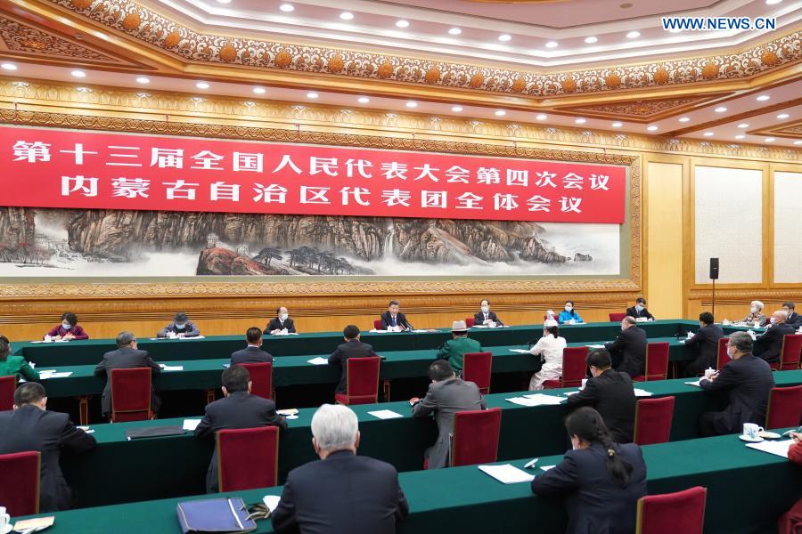 BEIJING, 5 marzo, 2021 (Xinhua) -- El presidente chino, Xi Jinping, también secretario general del Comité Central del Partido Comunista de China y presidente de la Comisión Militar Central, participa en una deliberación con los diputados de la delegación de la región autónoma de Mongolia Interior, en la cuarta sesión de la XIII Asamblea Popular Nacional, en Beijing, capital de China, el 5 de marzo de 2021. (Xinhua/Li Xueren)