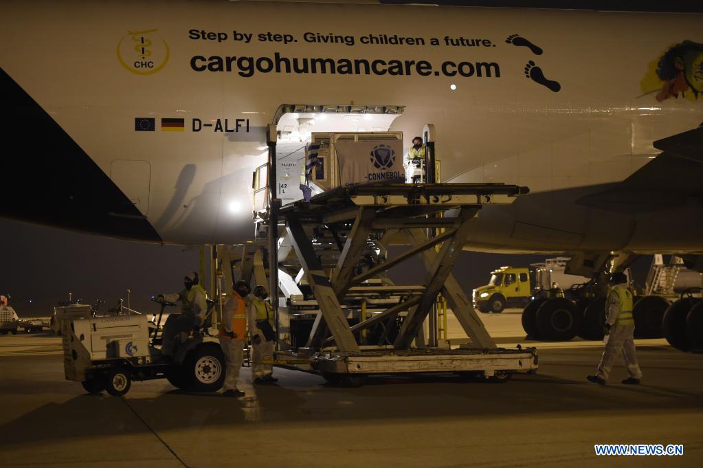 Imagen del 28 de abril de 2021 de trabajadores descargando el cargamento de vacunas CoronaVac desarrolladas por la farmacéutica china Sinovac contra la enfermedad del nuevo coronavirus (COVID-19), en el Aeropuerto Internacional de Carrasco, en Montevideo, capital de Uruguay. La Confederación Sudamericana de Fútbol (CONMEBOL), recibió el miércoles en Montevideo la donación de la farmacéutica china Sinovac de su vacuna contra la COVID-19. (Xinhua/Nicolás Celaya)