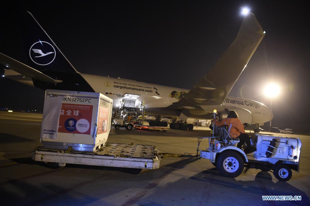 Imagen del 28 de abril de 2021 de un trabajador trasladando el cargamento de vacunas CoronaVac desarrolladas por la farmacéutica china Sinovac contra la enfermedad del nuevo coronavirus (COVID-19), en el Aeropuerto Internacional de Carrasco, en Montevideo, capital de Uruguay. La Confederación Sudamericana de Fútbol (CONMEBOL), recibió el miércoles en Montevideo la donación de la farmacéutica china Sinovac de su vacuna contra la COVID-19. (Xinhua/Nicolás Celaya)