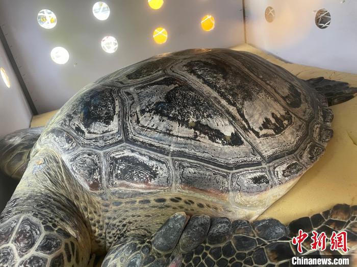 Una de las seis tortugas verdes transportadas a Sanya, provincia de Hainan, se ve en un contenedor especial el 15 de septiembre de 2021. [Foto: Chinanews.com]