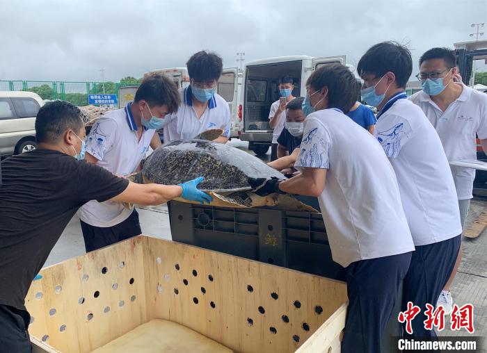Los trabajadores colocan con cuidado una tortuga verde en un recipiente especial, 15 de septiembre del 2021. [Foto: Chinanews.com]