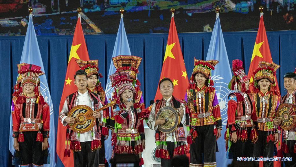 KUNMING, 11 octubre, 2021 (Xinhua) -- Artistas folclóricos realizan una presentación durante la ceremonia de inauguración de la 15a reunión de la Conferencia de las Partes de la Convención de las Naciones Unidas sobre la Diversidad Biológica, conocida como COP15, en Kunming, en la provincia de Yunnan, en el suroeste de China, el 11 de octubre de 2021. La COP15 se inauguró en Kunming el lunes. (Xinhua/Jiang Wenyao)