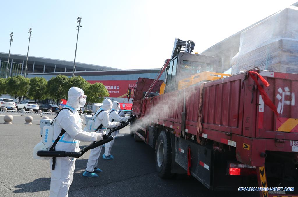 SHANGHAI, 23 octubre, 2021 (Xinhua) -- El primer lote de exhibiciones son desinfectadas previo a ser ingresadas al Centro Nacional de Exposiciones y Convenciones de Shanghai, una de las principales sedes de la IV Exposición Internacional de Importaciones de China, en Shanghai, en el este de China, el 23 de octubre de 2021. La exposición se llevará a cabo en Shanghai del 5 al 10 de noviembre de este a?o. (Xinhua/Fang Zhe)