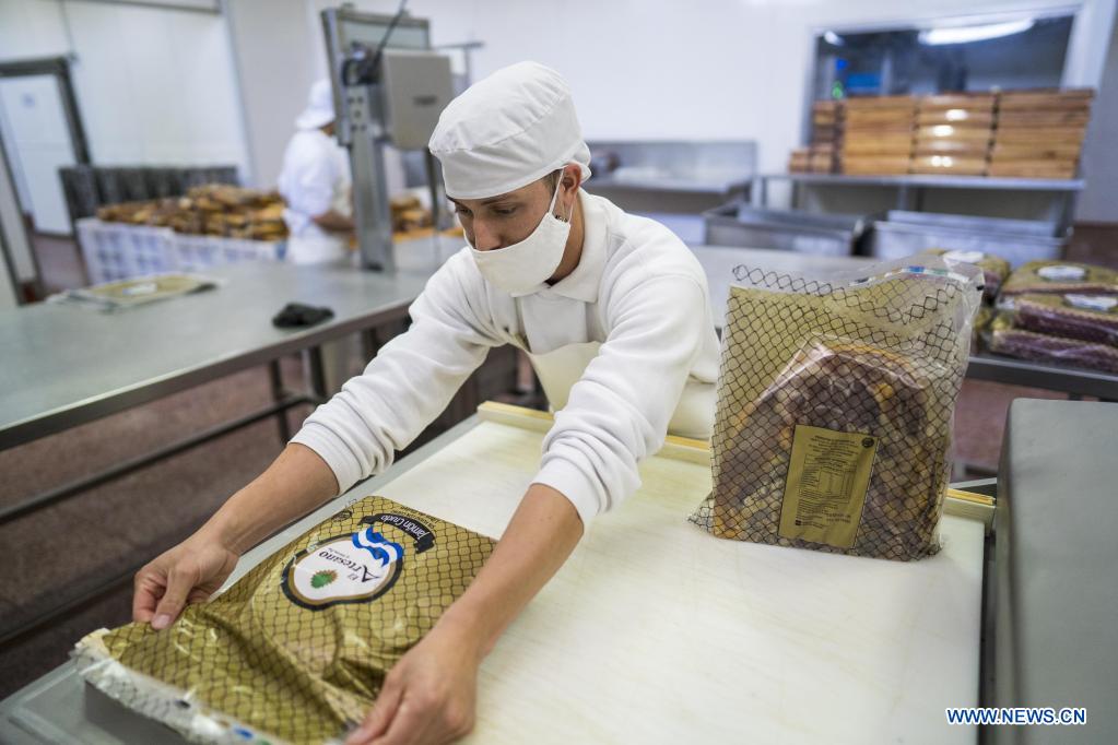 MARCOS PAZ, 3 noviembre, 2021 (Xinhua) -- Imagen del 20 de octubre de 2021 de un empleado envasando al vacío una pieza de jamón en el sector de envasado de la empresa El Artesano, en el municipio de Marcos Paz, Argentina. Por segundo a?o consecutivo las peque?as y medianas empresas del municipio Marcos Paz, en la provincia argentina de Buenos Aires, estarán presentes en la Exposición Internacional de Importaciones de China (CIIE, por sus siglas en inglés) que se celebrará del 5 al 10 de noviembre en Shanghai. Uno de los productos emblema del municipio en la CIIE será el Jamón Crudo Argentino, que produce la empresa El Artesano, primer y único jamón premium que cuenta con esta denominación de origen y que además está distinguido con el sello de calidad "Alimentos Argentinos, una Elección Natural" otorgado por el Ministerio de Agricultura, Ganadería y Pesca de este país. (Xinhua/Martín Zabala)