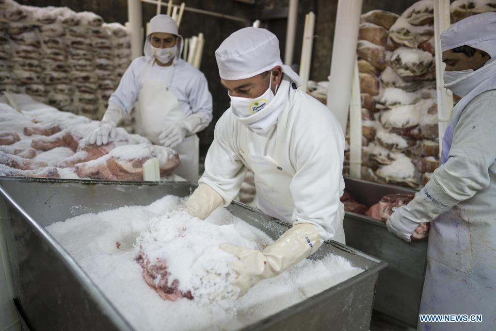 MARCOS PAZ, 3 noviembre, 2021 (Xinhua) -- Imagen del 20 de octubre de 2021 de un empleado cubriendo con sal una pieza de jamón en la cámara de salado de la empresa El Artesano, en el municipio de Marcos Paz, Argentina. Por segundo a?o consecutivo las peque?as y medianas empresas del municipio Marcos Paz, en la provincia argentina de Buenos Aires, estarán presentes en la Exposición Internacional de Importaciones de China (CIIE, por sus siglas en inglés) que se celebrará del 5 al 10 de noviembre en Shanghai. Uno de los productos emblema del municipio en la CIIE será el Jamón Crudo Argentino, que produce la empresa El Artesano, primer y único jamón premium que cuenta con esta denominación de origen y que además está distinguido con el sello de calidad "Alimentos Argentinos, una Elección Natural" otorgado por el Ministerio de Agricultura, Ganadería y Pesca de este país. (Xinhua/Martín Zabala)