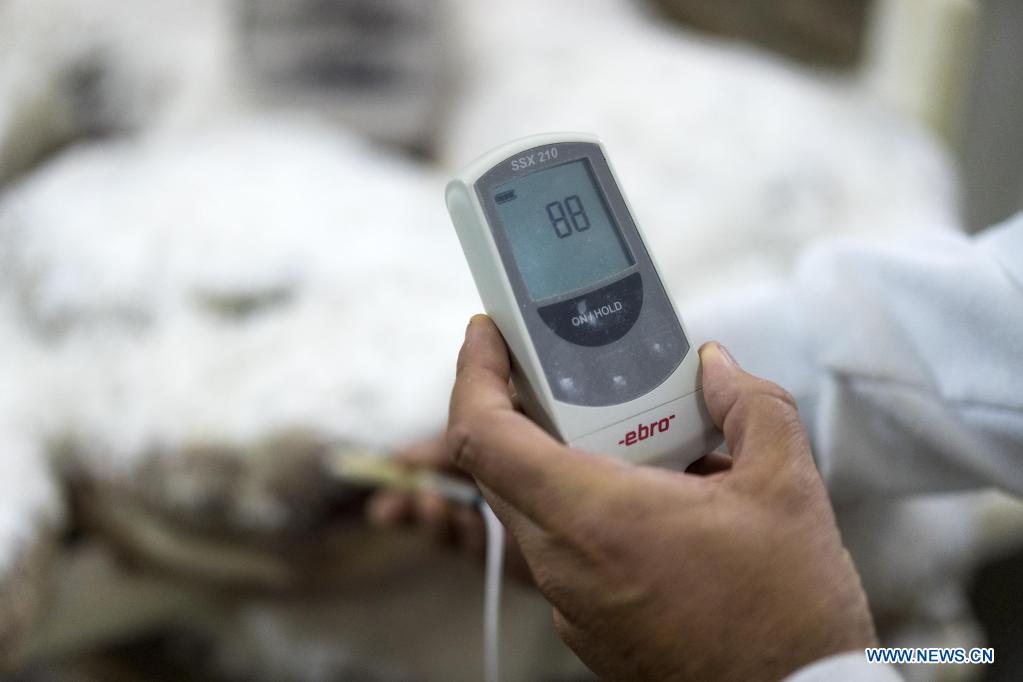 MARCOS PAZ, 3 noviembre, 2021 (Xinhua) -- Imagen del 20 de octubre de 2021 de un empleado tomando la temperatura de una pieza de jamón en la cámara de secado de la empresa El Artesano, en el municipio de Marcos Paz, Argentina. Por segundo a?o consecutivo las peque?as y medianas empresas del municipio Marcos Paz, en la provincia argentina de Buenos Aires, estarán presentes en la Exposición Internacional de Importaciones de China (CIIE, por sus siglas en inglés) que se celebrará del 5 al 10 de noviembre en Shanghai. Uno de los productos emblema del municipio en la CIIE será el Jamón Crudo Argentino, que produce la empresa El Artesano, primer y único jamón premium que cuenta con esta denominación de origen y que además está distinguido con el sello de calidad "Alimentos Argentinos, una Elección Natural" otorgado por el Ministerio de Agricultura, Ganadería y Pesca de este país. (Xinhua/Martín Zabala)