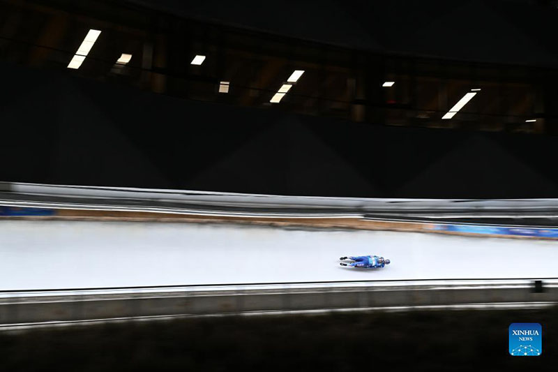 Chris Mazdzer / Jayson Terdiman de Estados Unidos compiten durante las competiciones individuales femeninas en la Copa del Mundo de la Federación Internacional de Luge (FIL) en Yanqing, Beijing, el 21 de noviembre de 2021. (Xinhua / Chen Yichen)