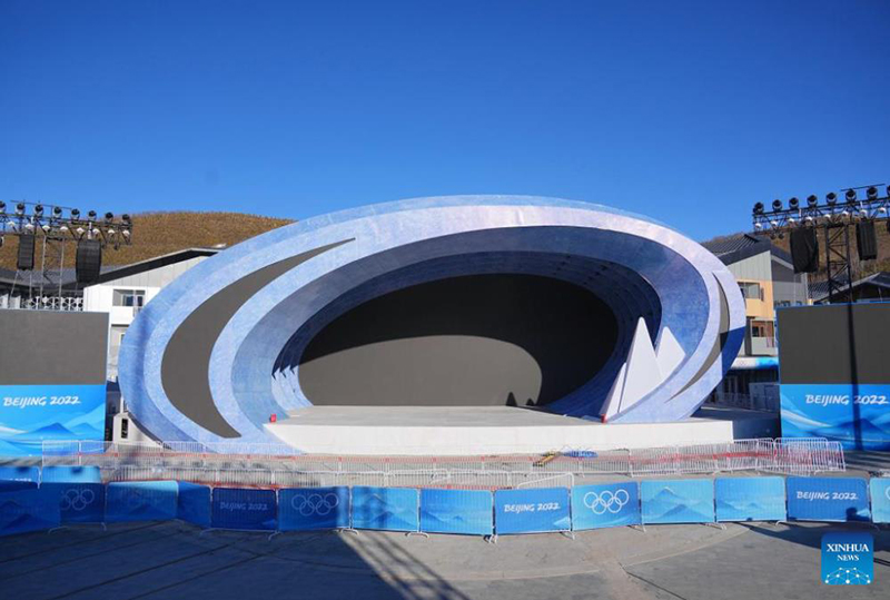 El escenario para la ceremonia de premiación en la zona de competiciones de Zhangjiakou de los Juegos Olímpicos y Paralímpicos de Invierno de Beijing 2022, en Zhangjiakou, provincia de Hebei, en el norte de China, el 28 de diciembre de 2021. (Xinhua / Yang Shiyao)