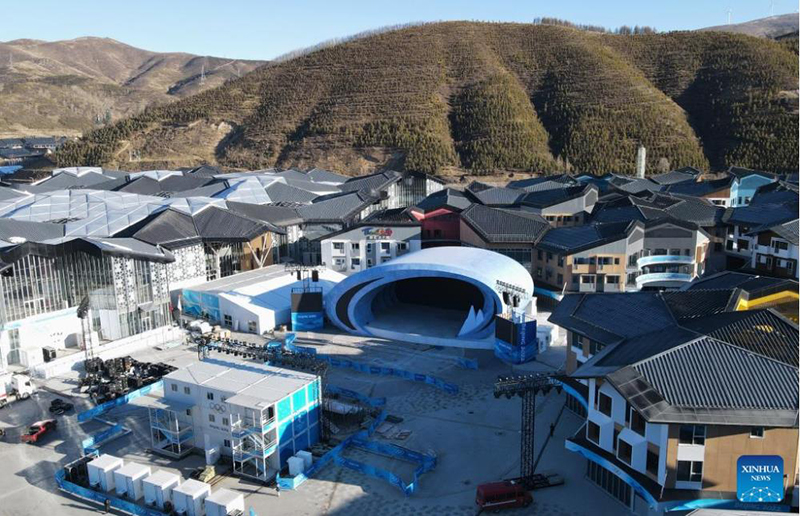 Foto aérea tomada el 28 de diciembre de 2021 muestra el escenario de la ceremonia de entrega de premios en la zona de competiciones de Zhangjiakou de los Juegos Olímpicos y Paralímpicos de Invierno de Beijing 2022, en Zhangjiakou, provincia de Hebei, en el norte de China. (Xinhua / Yang Shiyao)