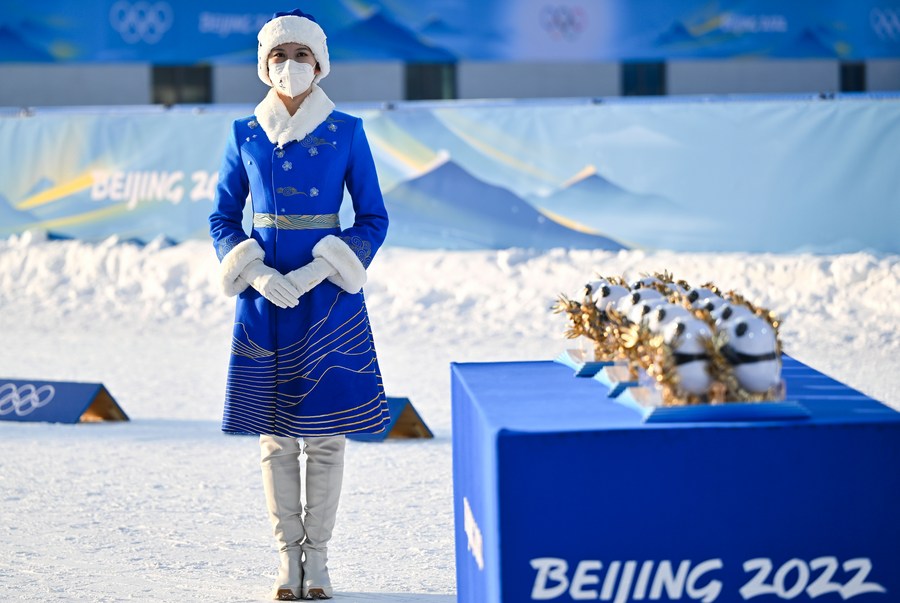 Una voluntaria participa en la ceremonia de flores de los relevos 4x6 km femeninos del Biatlón en el Centro Nacional de Biatlón, en Zhangjiakou, en la provincia de Hebei, en el norte de China, el 16 de febrero de 2022. (Xinhua/Guo Cheng)