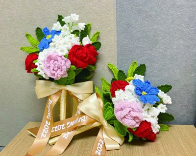 Los ramos no están hechos de flores frescas, sino de ganchillo. Estos ramos de lana de ganchillo no se marchitarán y se producen con técnicas que figuran como patrimonio cultural inmaterial en China.