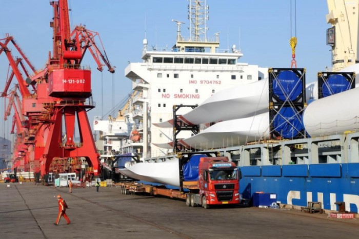 Las turbinas eólicas se cargan en un barco oceánico en una terminal en Lianyungang, provincia oriental china de Jiangsu, el 31 de diciembre de 2021. (Foto: Wang Chun/ Pueblo en Línea)