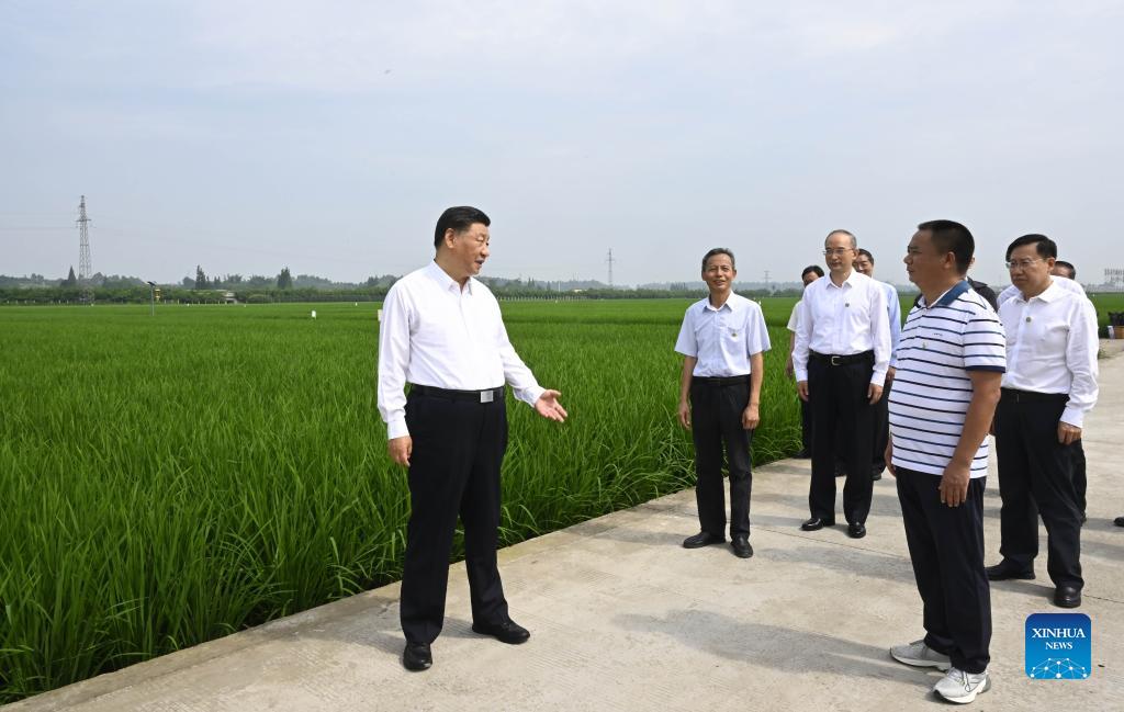 El presidente chino, Xi Jinping, también secretario general del Comité Central del Partido Comunista de China y presidente de la Comisión Militar Central, visita la aldea de Yongfeng para conocer los esfuerzos locales para impulsar el desarrollo de tierras agrícolas de alto nivel, aumentar la producción de granos, promover la vigorización de las zonas rurales y mantener la prevención y el control efectivos de la COVID-19, en Meishan, en la provincia de Sichuan, en el suroeste de China, el 8 de junio de 2022. Xi inspeccionó el miércoles la ciudad de Meishan. (Xinhua/Li Xueren)