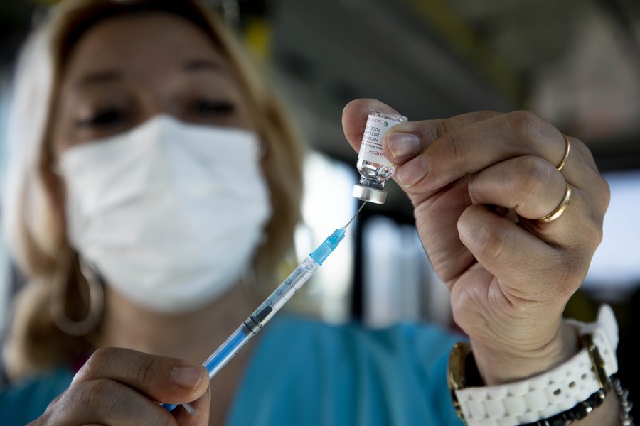 Una trabajadora de la salud prepara una dosis de la vacuna contra la COVID-19, desarrollada por la farmacéutica china CanSino, en un puesto móvil de vacunación del barrio La Cárcova, en el distrito de José León Suárez, Argentina, el 1 de octubre de 2021. (Xinhua/Martín Zabala)