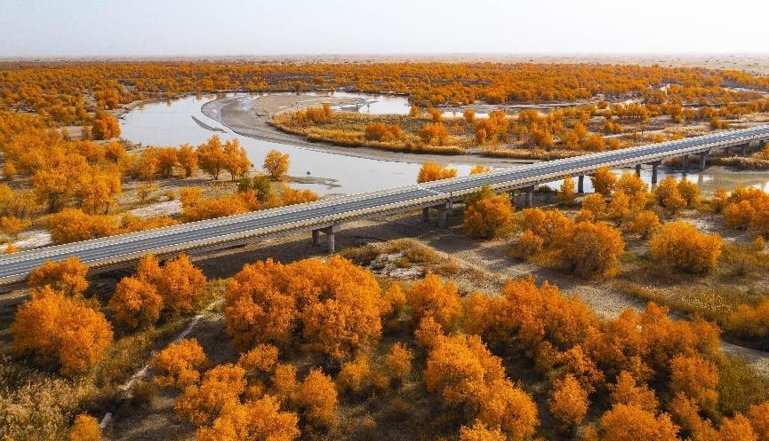 La foto tomada el 31 de octubre de 2022 muestra una vista pintoresca de un puente de carretera sobre el río Tarim, en la región autónoma Uygur de Xinjiang, en el noroeste de China. (Pueblo en Línea/Wang Zhipeng)