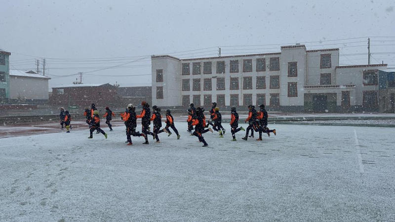 Miembros de un equipo de fútbol del condado de Qumalai entrenan en el clima frío. (Foto: Sun Hai)