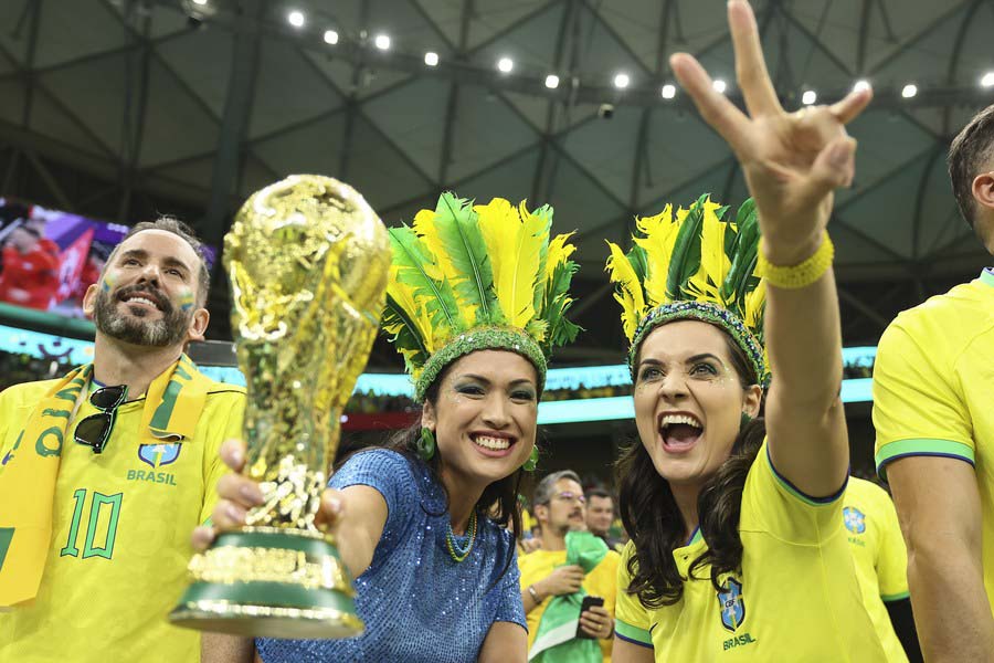 Aficionados reaccionan previo al partido del Grupo G entre Brasil y Serbia en la Copa Mundial de la FIFA 2022 en el Estadio Lusail, en Lusail, Qatar, el 24 de noviembre de 2022. (Xinhua/Lan Hongguang)